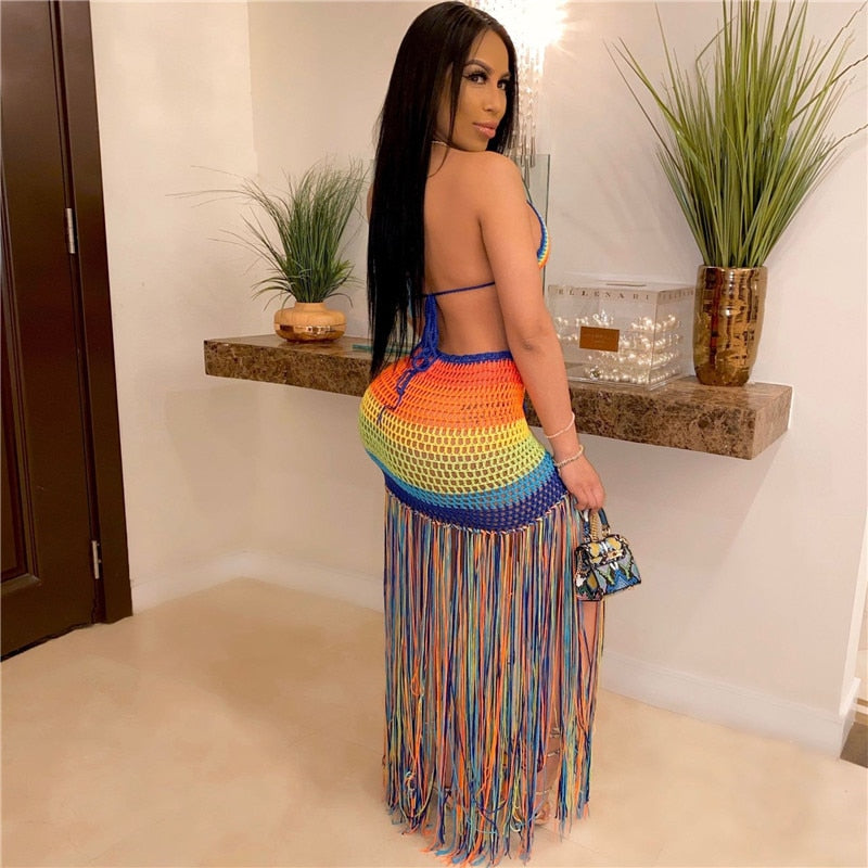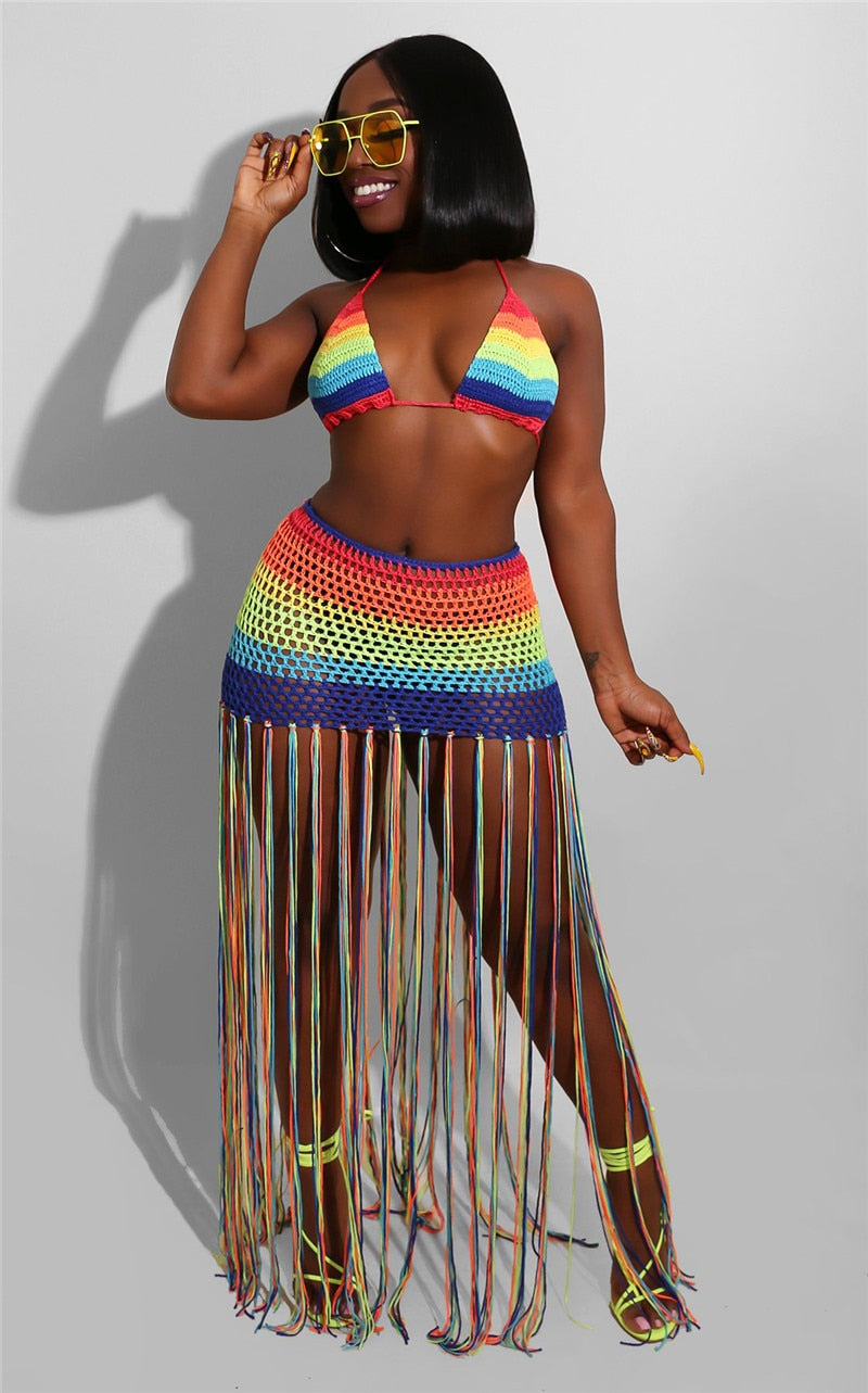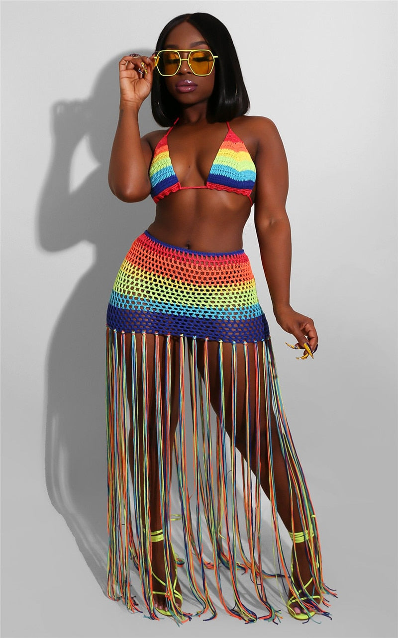 ANJAMANOR Rainbow Crochet Tassel Sexy 2 Piece Set Crop Top and Skirt Beach Party Club Birthday Outfits for Women D48-AC97