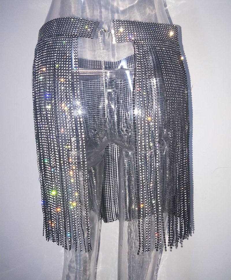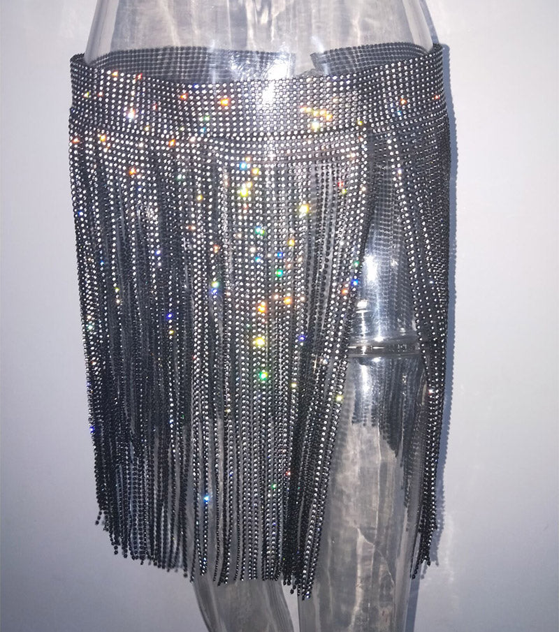 Diamonds Studded Mini Skirt Women Sparkle Sequin Tassel Crystal Skirt