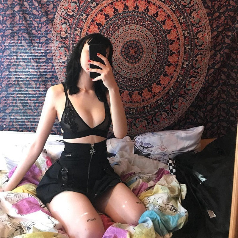 InstaHot Halloween Gothic A Line Skirts Women Autumn Zipper Pleated Plaid School Mini Skirt Strap Sexy Solid Suspender Bottom